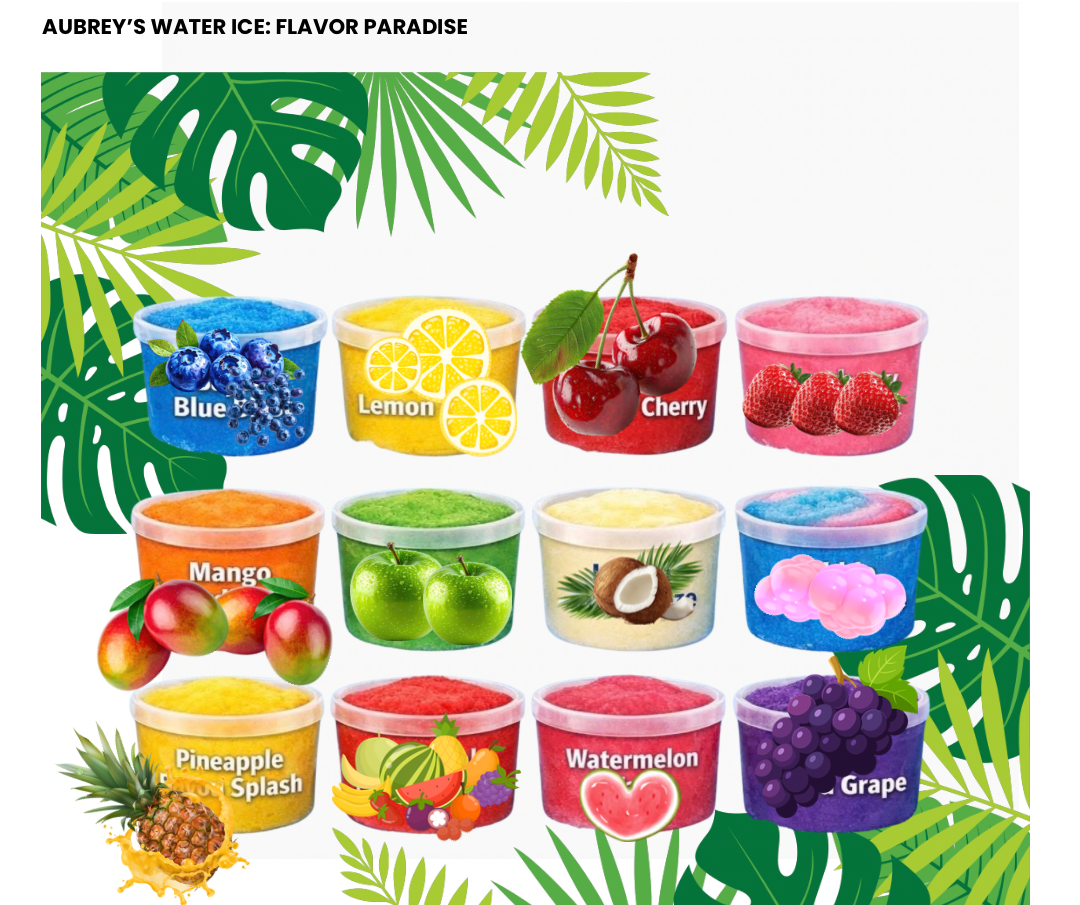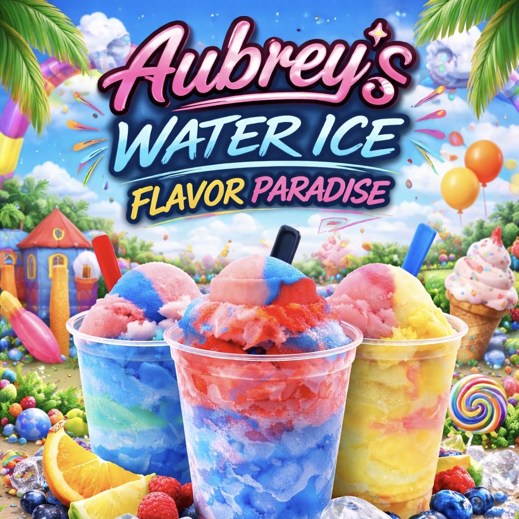 At Aubrey's Water Ice, we serve an inviting variety of flavors like blueberry, mango, sour green apple, and bubble gum. Our uniquely soft and creamy texture feels lighter than ice cream, delivering refreshment you’ll love in every scoop.